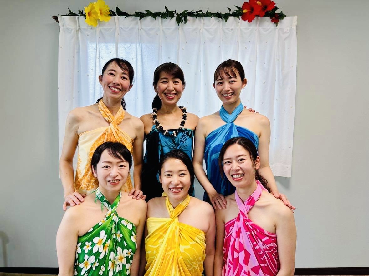 最高の笑顔でロミロミを学ぶオハナ(生徒)たち。